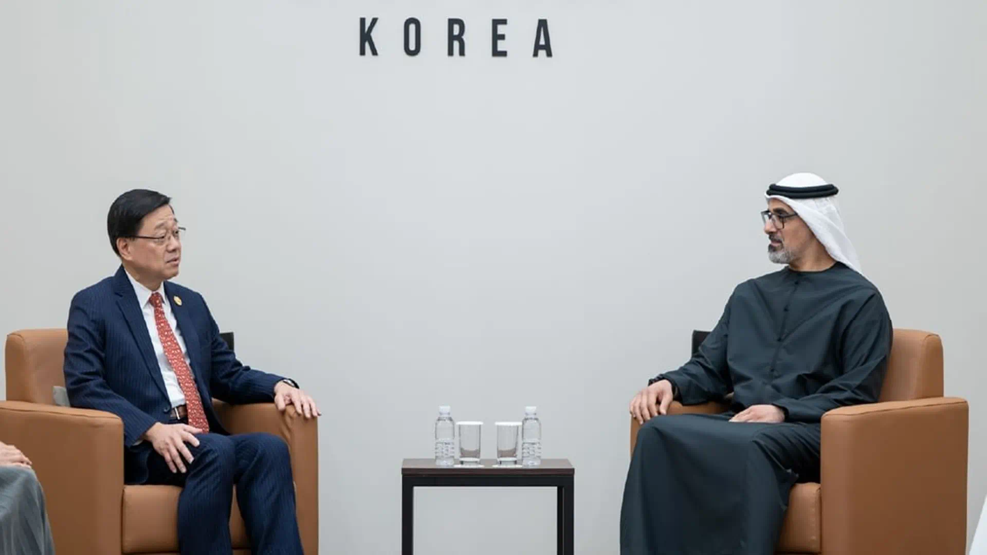 Sharjah24 - WAM: His Highness Sheikh Khaled bin Mohamed bin Zayed Al Nahyan, Crown Prince of Abu Dhabi, has met with John Lee, Chief Executive of Hong Kong, on the sidelines of the Asia-Pacific Economic Cooperation (APEC) forum, which brings together leaders and heads of government from 21 APEC member states.