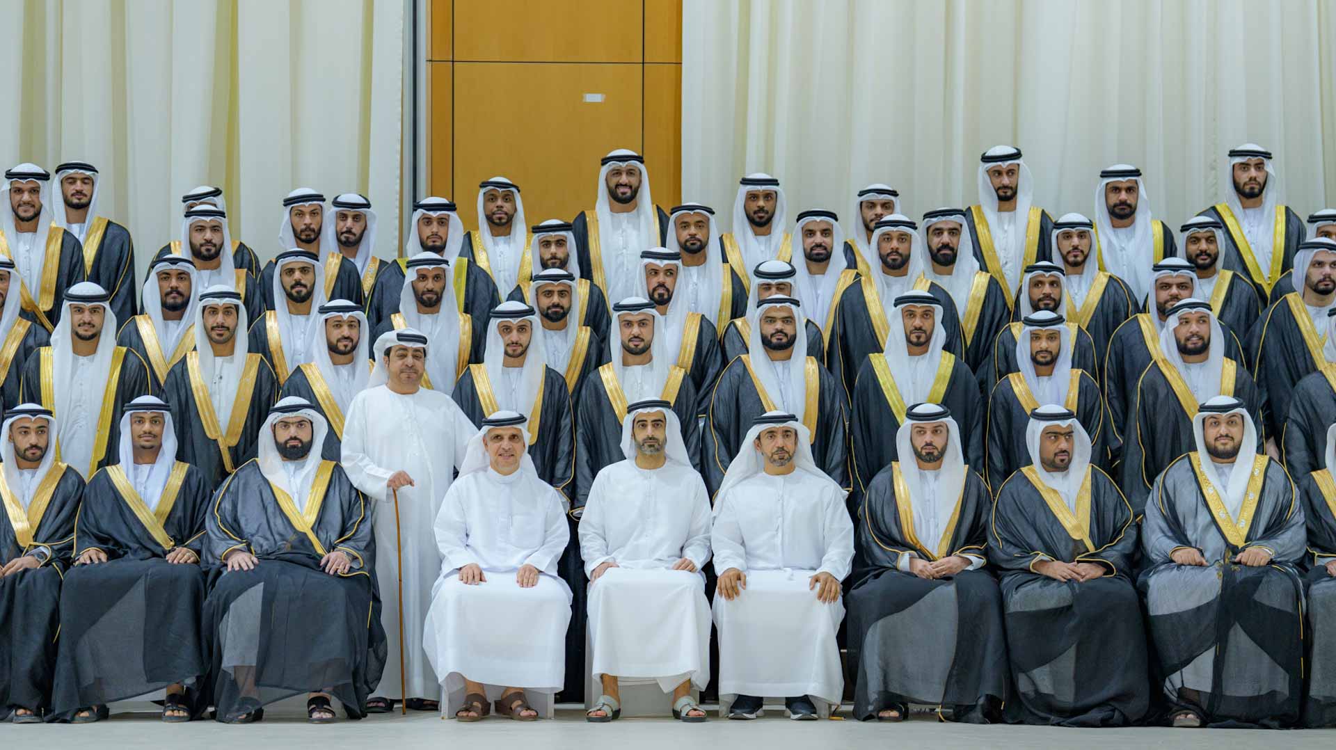 At the end of the ceremony, the Chairman of the Sharjah Ruler’s Office posed for group photos with the newlyweds, who expressed their gratitude for his attendance and for honouring the occasion, celebrating the start of their married lives, the building of their families, and their role in returning the favour to the nation.