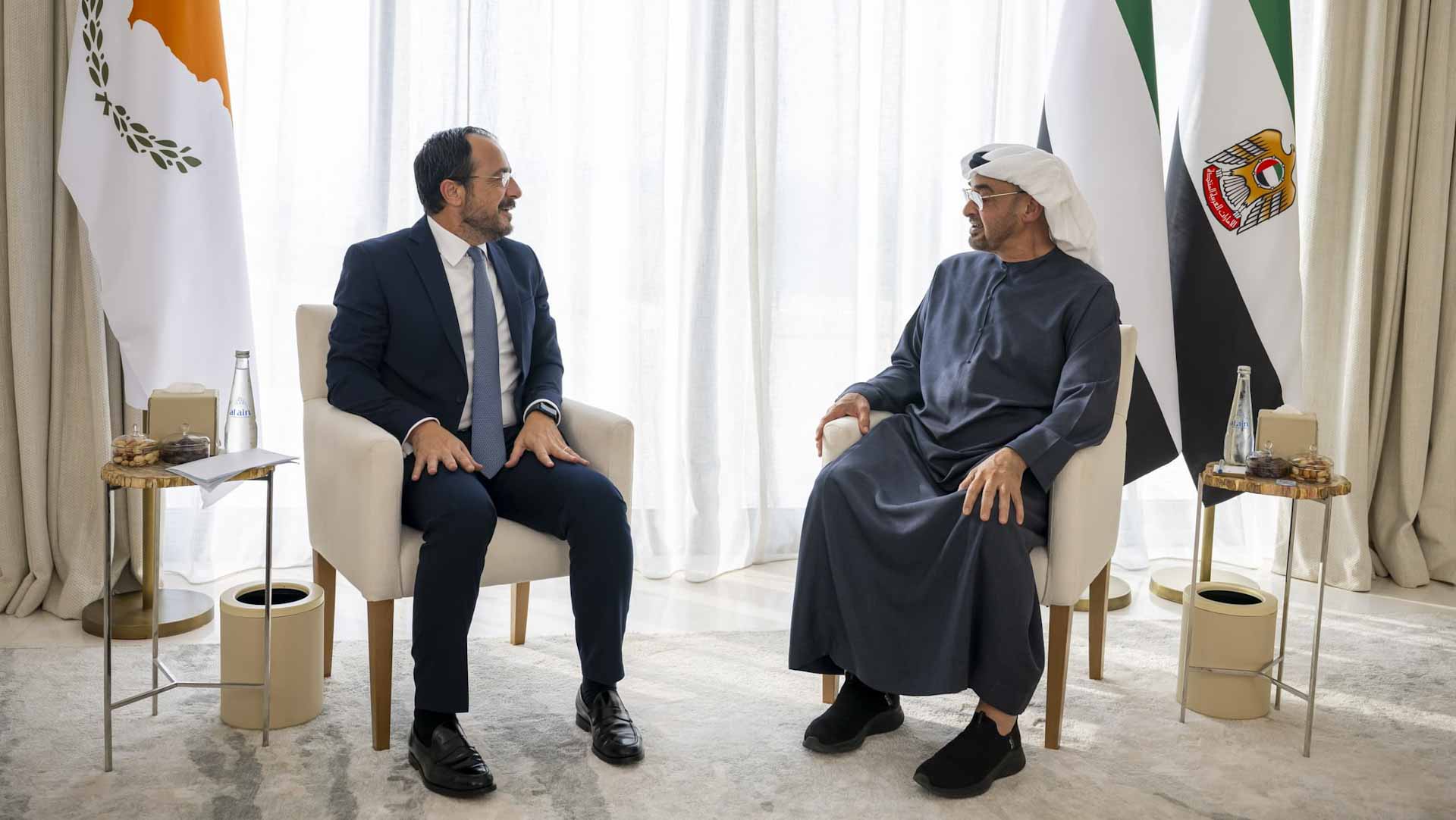 Upon arrival, UAE President His Highness Sheikh Mohamed bin Zayed Al Nahyan was welcomed with an official reception ceremony that included the national anthems of the UAE and Cyprus and an inspection of the honour guard.