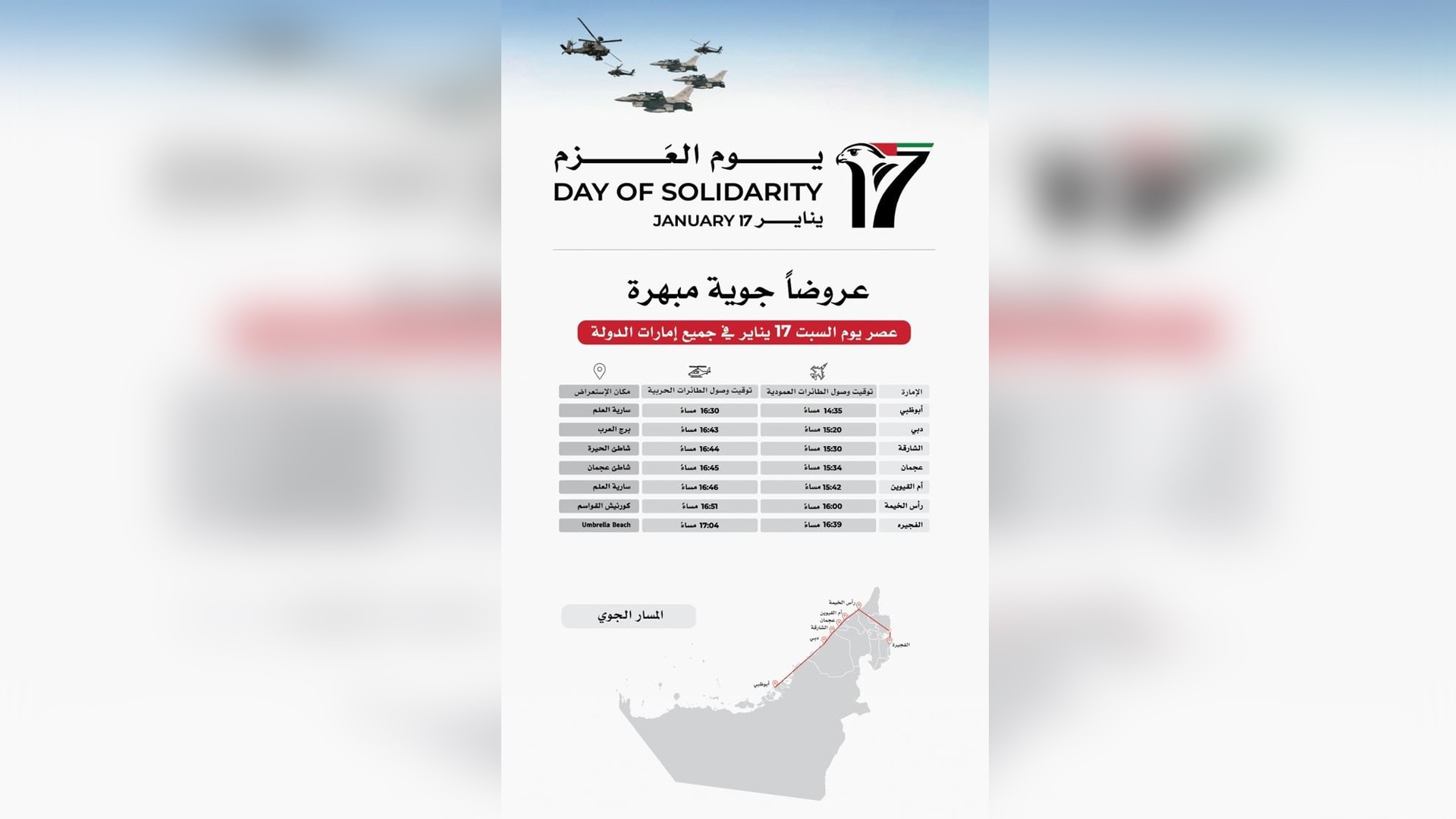 The nationwide aerial procession will feature a diverse fleet of helicopters and fighter jets, commencing in Abu Dhabi and flying over Dubai, Sharjah, Ajman, Umm Al Qaiwain, Ras Al Khaimah and Fujairah.