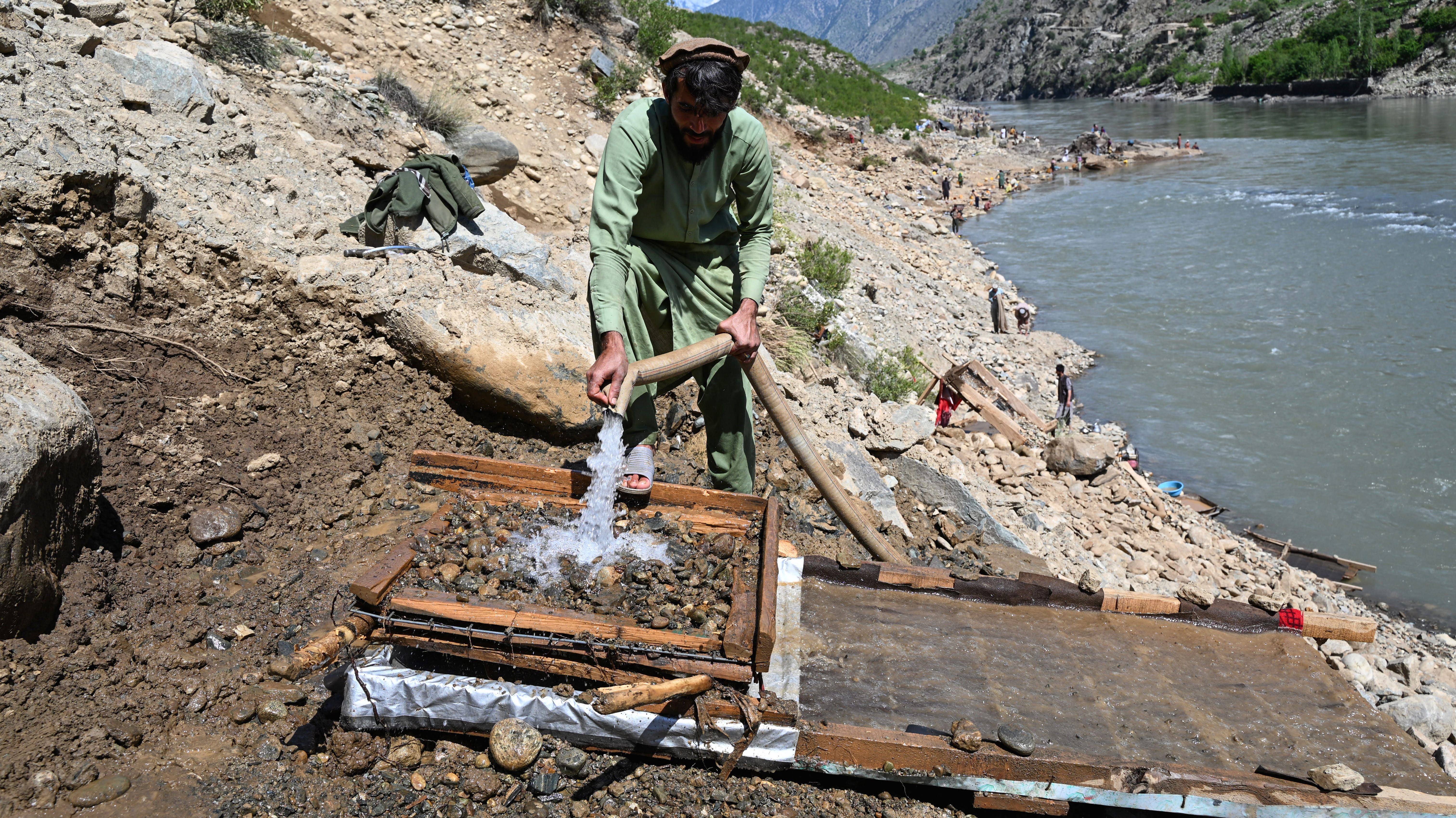 At the foot of snow-dusted peaks near the Pakistan border, workers sift through rocks and sediment in dry riverbeds, using river water to filter out fine particles that may contain gold, in areas surrounding Kharwalu village in Kunar province.